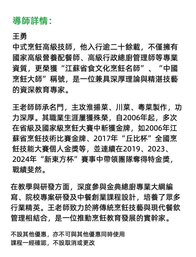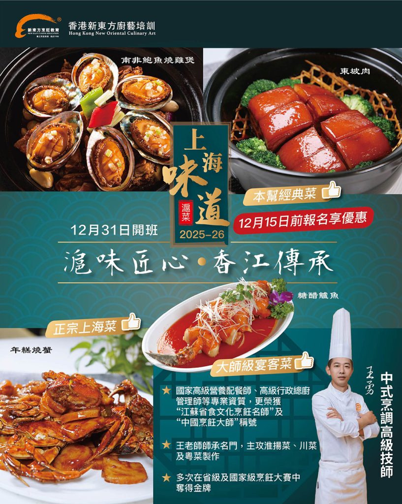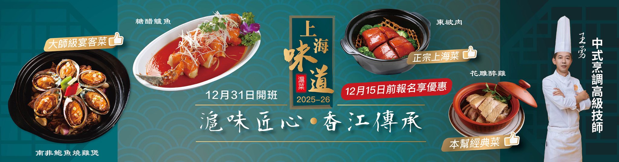 課程內容兼顧經典與實用,學員將深入學習多款招牌名菜,包括:色澤紅亮、醬香濃郁的「紅燒獅子頭」與「本幫醬鴨」;軟糯入味、肥而不膩的「東坡肉」;以及宴客佳餚「花雕醉雞」與「糖醋鱸魚」。此外更特別加入「年糕燒蟹」﹑「枝竹羊腩煲」等時令風味,讓您掌握不同節令烹調精髓。