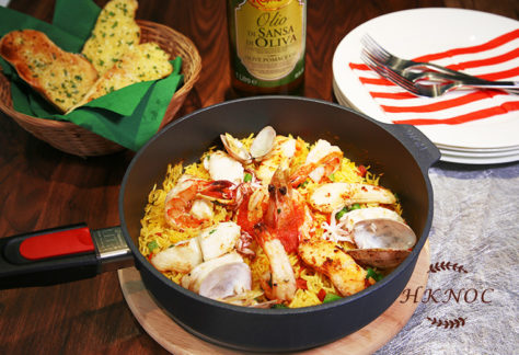 紅花辣肉腸海鮮飯配蒜蓉法包