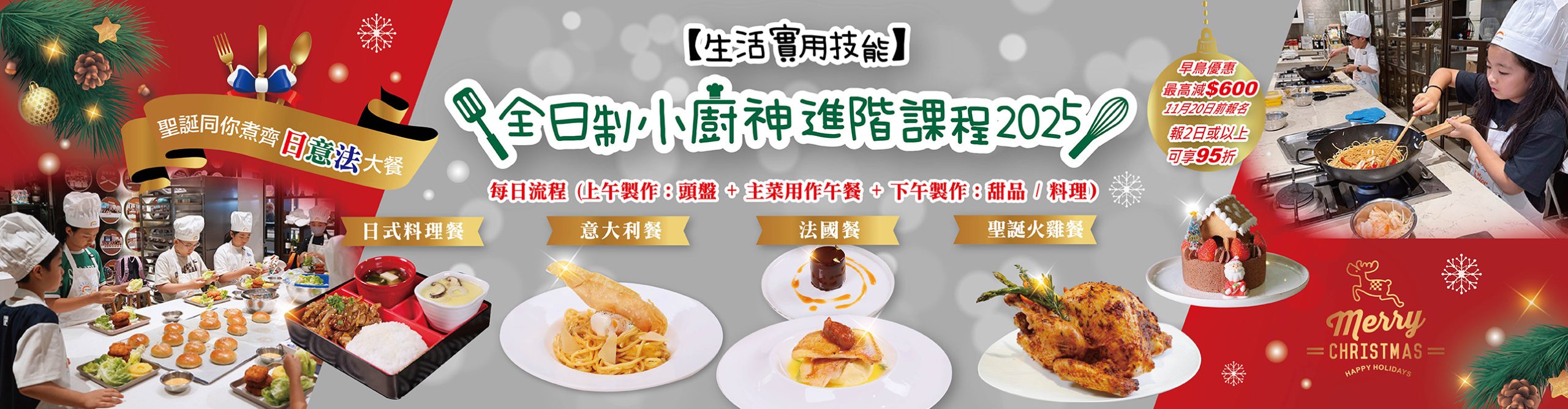 小朋友對烹飪有興趣又有一定煮食經驗,想鍛煉他們的烹飪﹑獨立能力,新東方廚藝培訓舉辦的耶誕節小廚神全日制進階班,本課堂採用全日制模式,上下午一共學習製作3道料理,包括前菜﹑主菜及甜品,將會是個既充實同時富挑戰性的活動,讓孩子成為一日大廚,享受烹飪的樂趣。