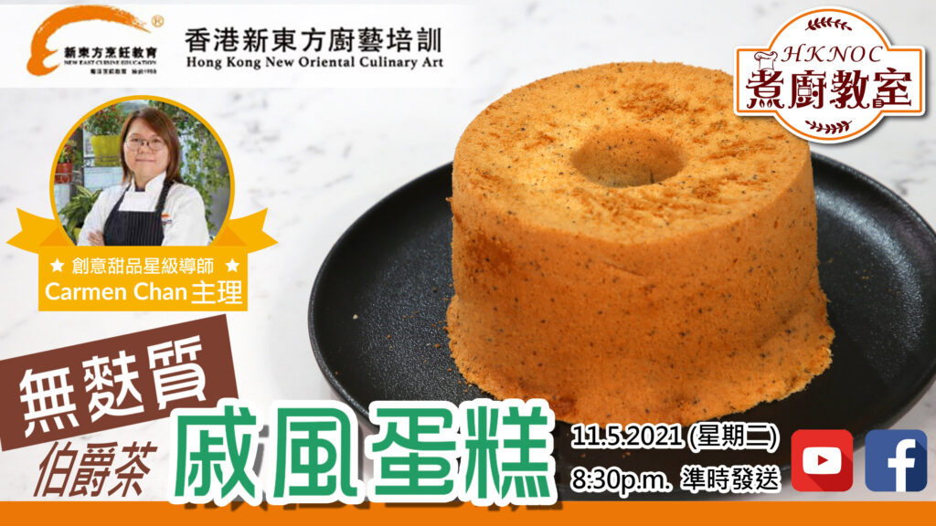 【煮廚教室】第二彈,由香港新東方廚藝培訓 創意甜品師Carmen,為一眾麩質敏感人仕,提供一個窩心之選擇 《無麩質伯爵茶戚風蛋糕》,一般坊間的現成烘焙甜品, 都大多含有麩質,麩質敏感的朋友,在飲食中都可能會引至消化道症狀或是腸胃不適等症狀,今次窩心之選《無麩質伯爵茶戚風蛋糕》可能是對麩質敏感的朋友的另一個好選擇。
