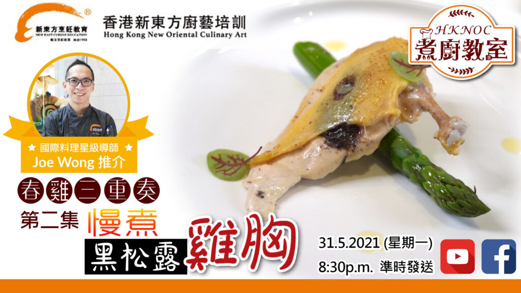 【煮廚教室】第4彈又來了,香港新東方廚藝培訓 西餐導師Joe Wong,以一隻小小的春雞製作出三道不同的菜色,今次以上集留下的雞胸,配以黑松露,以慢煮手法留下食材的真原味,《慢煮黑松露雞胸》既有軟滑雞肉,配以黑松露的獨特香氣,還同場教授黑松露醬的獨有保存方法,萬勿錯過。