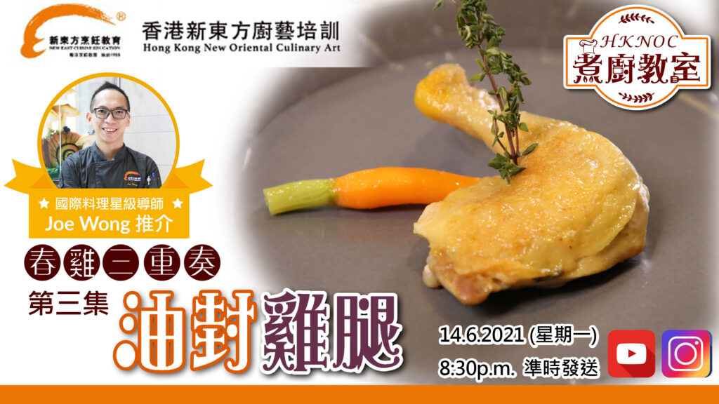 【煮廚教室】春雞三重奏的最後一彈來了,香港新東方廚藝培訓 西餐導師Joe Wong,以一隻小小的春雞製作出三道不同的菜色,今次以用上最後的春雞雞腿,以法式料理中的最考功夫的菜式油封鴨腿手法,變奏出一道簡單又易做的菜式,《油封雞腿》既不油膩又有法式料理中獨特鴨油香氣,萬勿錯過。