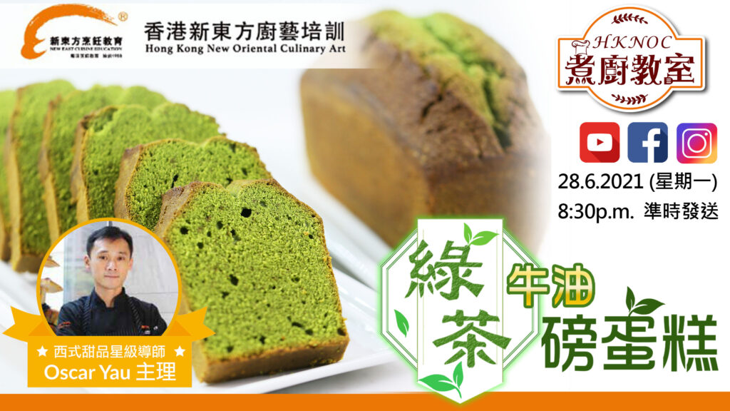 今次由香港新東方廚藝培訓 西甜導師 Oscar,教授《綠茶牛油磅蛋糕》,磅蛋糕一種由18世紀傳統的甜品,配方容易記憶,以綠茶為主調,配以牛油磅蛋糕的滿滿牛油香味,蛋糕口感實而不華,如配上一杯熱熱綠茶, 一個下午茶就在餐桌上交織出滿滿的幸福感。