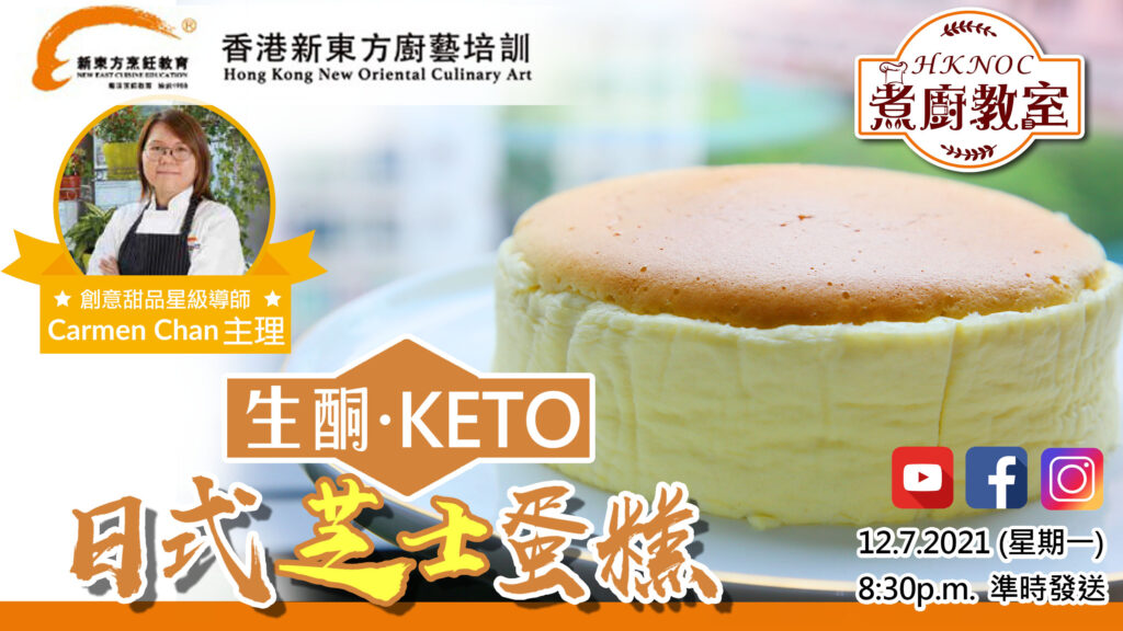 今次由香港新東方廚藝培訓 創意甜品師 Carmen 親自教授製作 生酮KETO《日式芝士蛋糕》,為了正在生酮飲食的你,在那個肚子咕噜咕噜的下午茶時候,帶給你一個可以一解甜品渴望的芝士蛋糕。