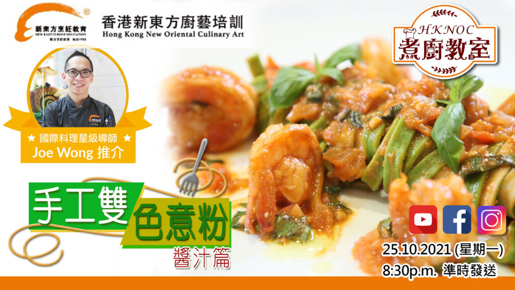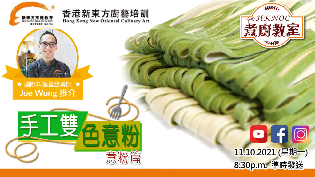 【煮廚教室】由香港新東方廚藝培訓 西餐導師Joe Wong,久別再出場,今次以一雙巧手教導大家在家中都得製作出新鮮的《手工雙色意粉》,以菠菜及蛋為主要材料,做出健康天然的新鮮意粉,簡單烹調就可以一嚐更高層次的意粉境界。
