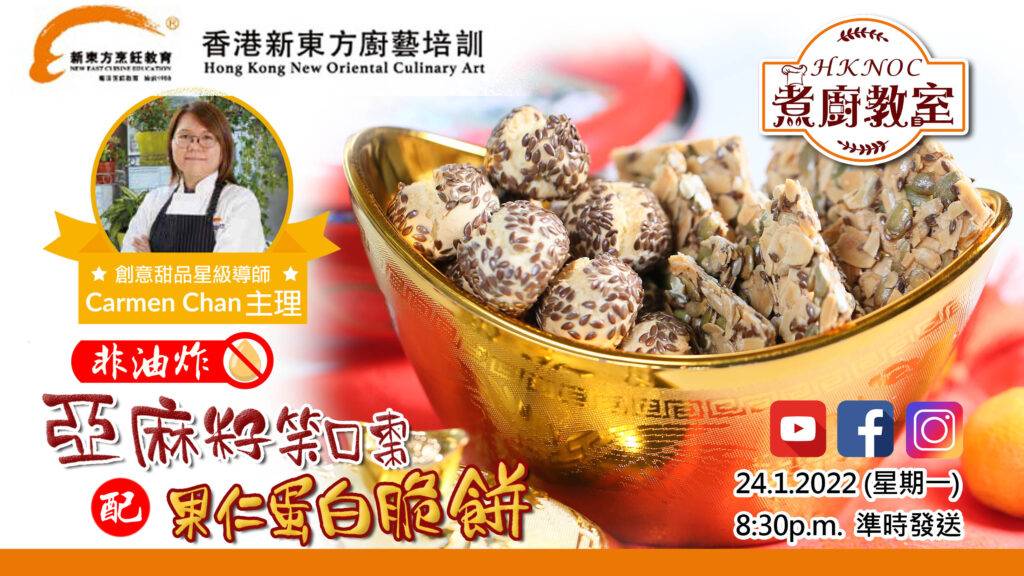 【煮廚教室】新年快到,賀年食物種類煩多,但大多是油炸食品, 熱氣上火,今次由香港新東方廚藝培訓 創意甜品師 Carmen Chan 為大家教授一個可以用作賀年食品的健康小食,100%非油炸,完全不熱氣上火,配合亞麻籽高纖維降血壓《非油炸亞麻籽笑口棗配果仁蛋白脆餅》,一定成為你賀年全盒上最最最受歡迎的健康小食。