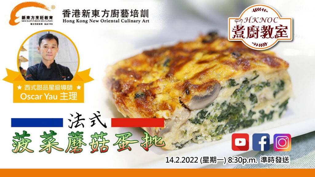 用上了牛奶、芝士、菠菜,豐富鈣質,批身厚實多種食材混合散發濃濃芝士香氣。每一口都充滿幸福的滋味,用上菠菜為主要餡料,多吃一兩件也不怕,大大平衝一下內心的罪惡感。今次由香港新東方廚藝培訓 西點導師 Oscar Yau 教大家一道法式經典小食《法式菠菜蘑菇蛋批》,簡單易整,健康又美味!