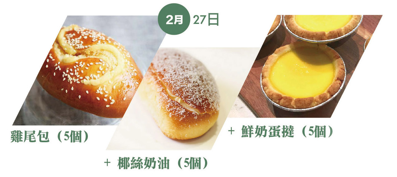 精品麵包:雞尾包+椰絲奶油包+鮮奶蛋撻